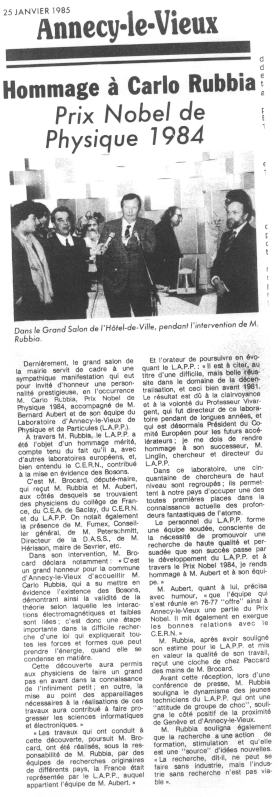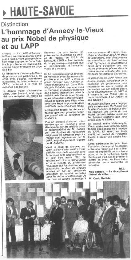 La visite de C. Rubbia à Annecy-le-Vieux, berceau du LAPP, rapportée par les journaux locaux: